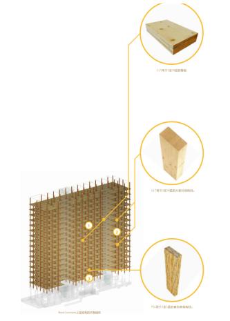 在此項目中大量了使用了工程木產品,如層板膠合木(GLT)、正交膠合木(CLT)、平行木片膠合木(PSL)、釘接膠合木(NLT)、單板層積膠合木(LVL)、層疊木片膠合木(LSL)、定向刨花板(OSB)。
