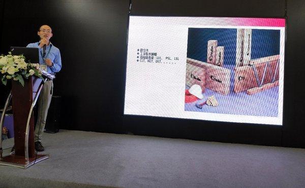 上海交通大學設計總院木結構所所長詹暉先生介紹了工程木節點連接應用。詹所長在演講中談到現代重型木結構是指采用工程木產品以及方木或者原木作為承重構件的大跨度梁柱結構。工程木產品不只是提高了木材的利用率,且性能穩定,結構強度高。在節點設計方面,通過不同的金屬連接件,讓木結構的造型,連接形式都更有可塑性。